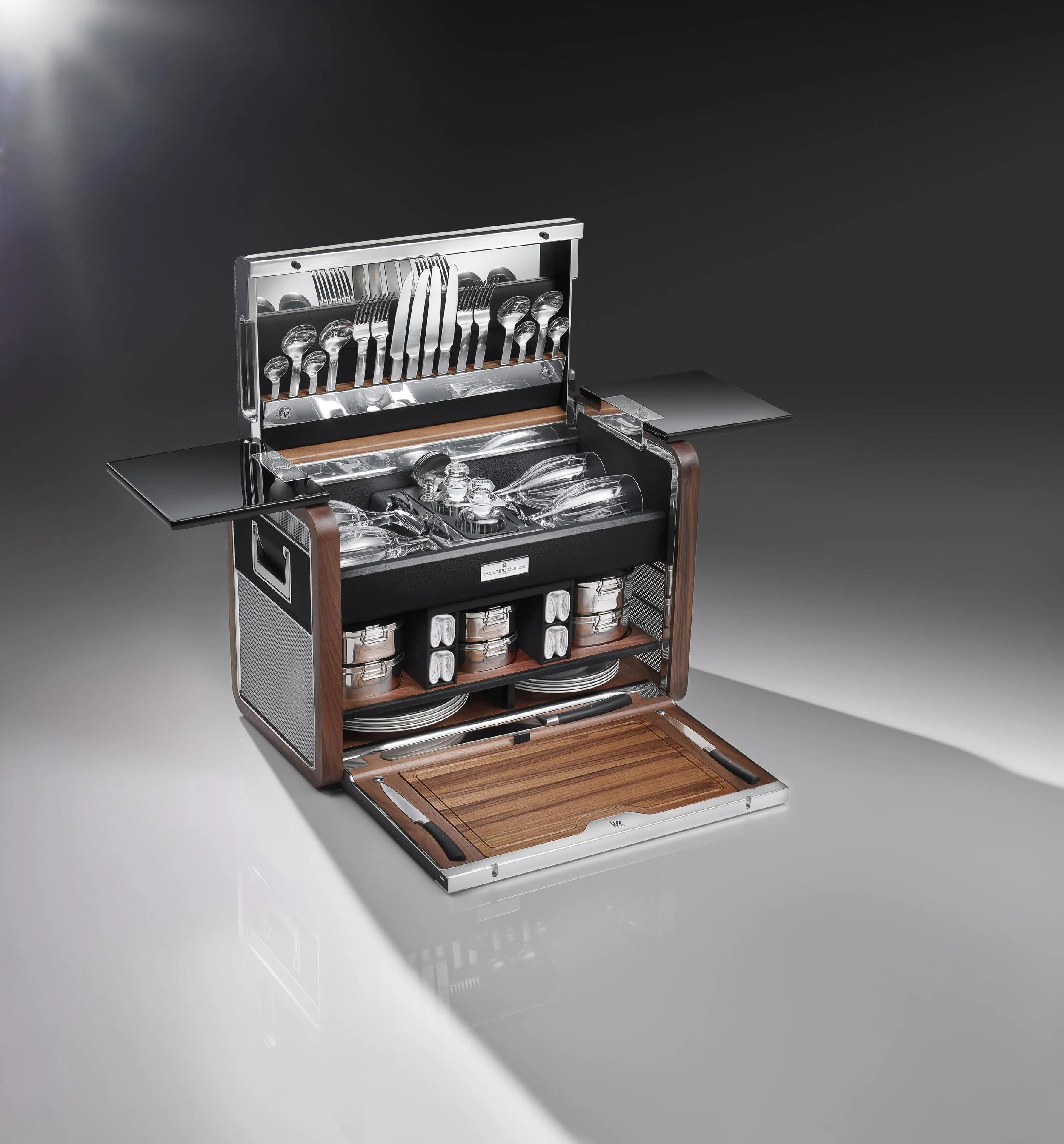 The leather and wood interior shelving of the hamper contains lead crystal wine glasses, handmade stainless steel cutlery, napkins embroidered with the Rolls-Royce monogram in Arctic White, and a handcrafted American Walnut chopping board. A final flourish, the Zenith Collection Picnic Hamper comprises unique crockery, with painted black and platinum detail around the edges.