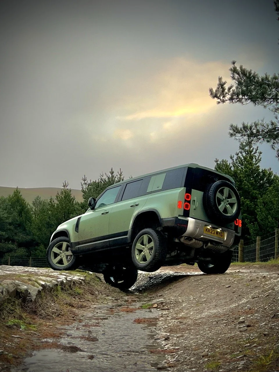Yes, the Defender’s front wheel is airborne. Yes, it looks a bit odd compared to an old 110 with a live axle drooping gracefully into the rut.