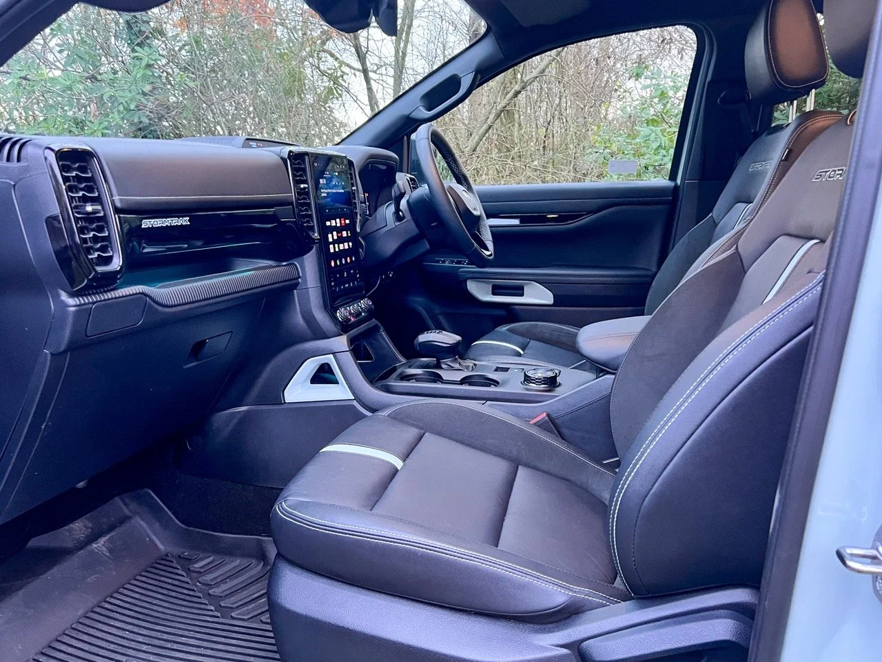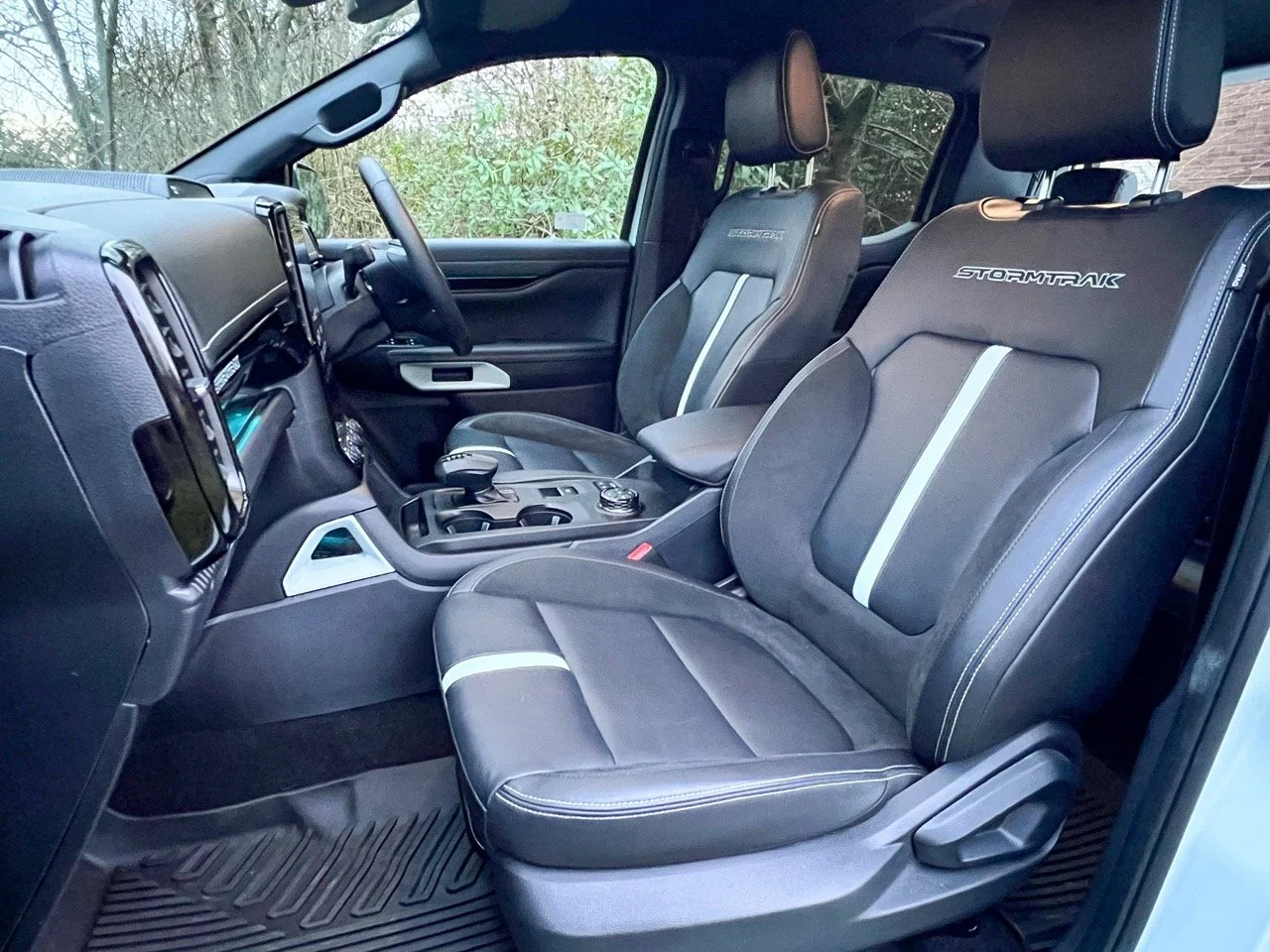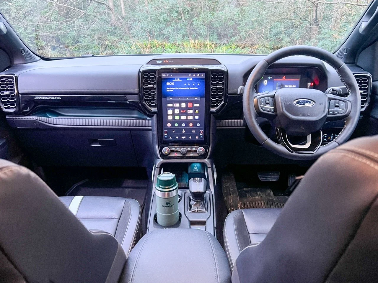 Ford has given the Stormtrak PHEV a cabin that feels far more SUV than agricultural tool. You get plush seats, quality materials, pleasant stitching patterns, and the now-traditional giant portrait touchscreen that looks like someone bolted an iPad on with self-tappers.
