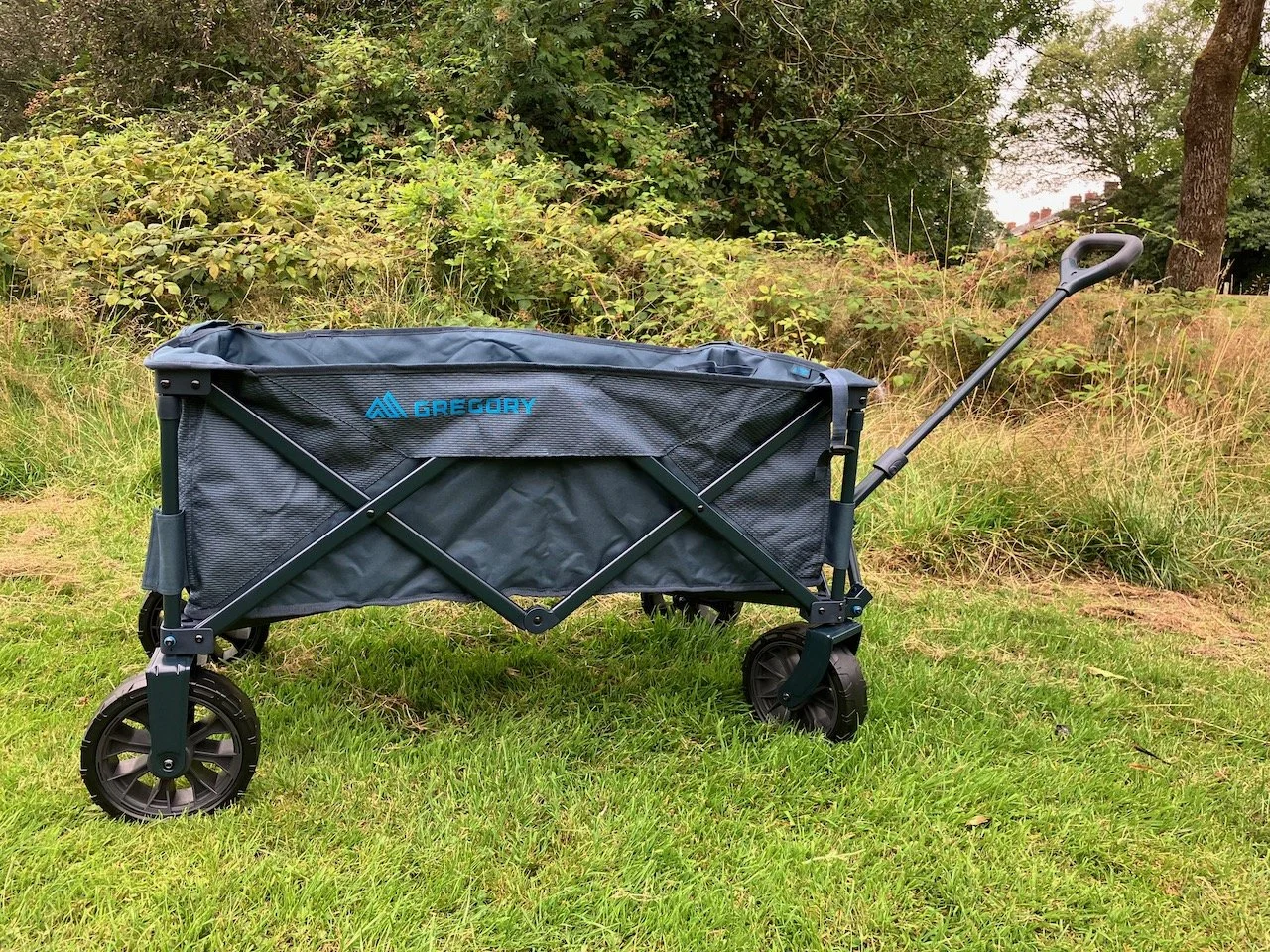 The price seems like the obvious drawback, but at the festival, Muddy Madam tested it against her friend’s newly purchased £80 wagon, and you could tell the difference immediately. Hers wasn’t as big, could hold less than half the weight the Gregory can, and the handle felt like it could break at any moment. The manoeuvring of her much smaller wheels was tough going, even on the hard, dry, undulating hills, and it also didn’t come with a cover.