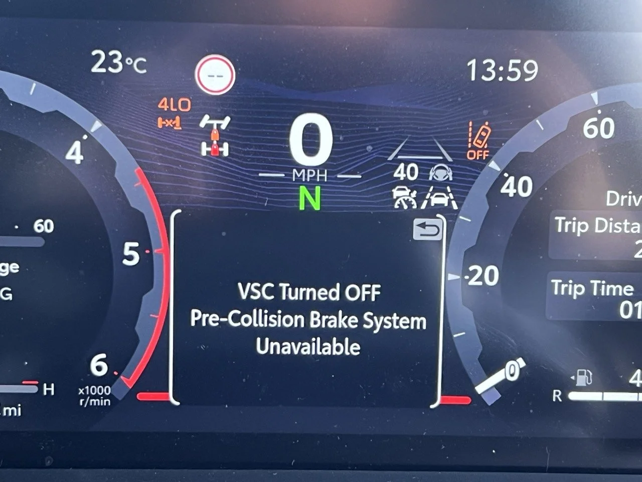 Slip the Land Cruiser into low range, and you’ll be met with a flurry of dash warnings that seem determined to make a stressful descent even more distracting. As soon as you engage low, the 250 automatically disables or limits various driver aids, things like Vehicle Stability Control (VSC), Pre-Collision Braking, Lane Departure Alert, and so on. Which makes sense, because you don’t want the car slamming on the brakes mid-bog.