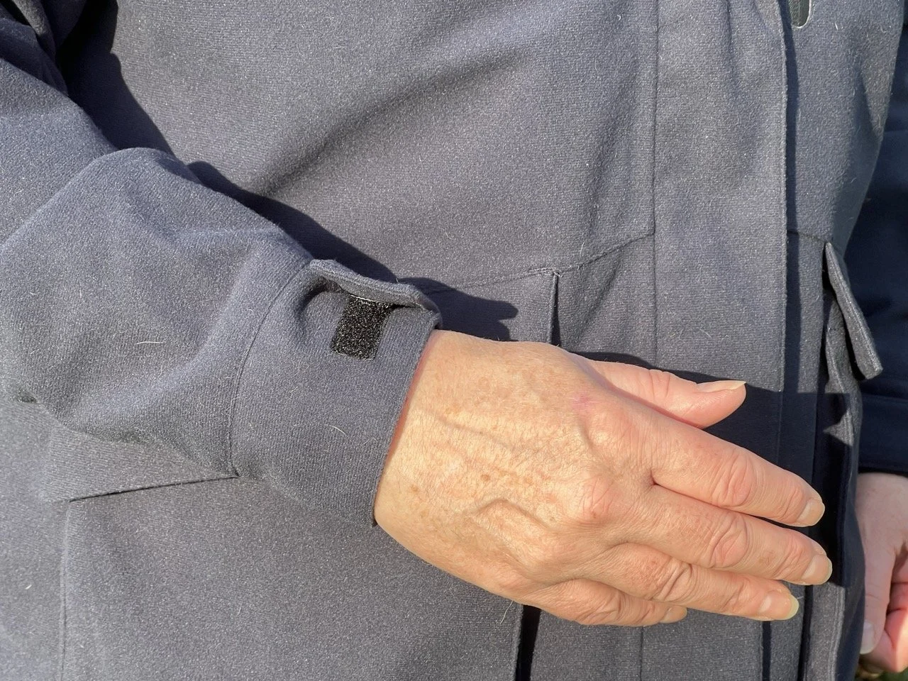 There are velcro tightening strips on the wrists, and cinching elastic along the bottom edge so that you can keep any gusts out. I also liked that it has a long back to cover your bottom (even on my tall frame).