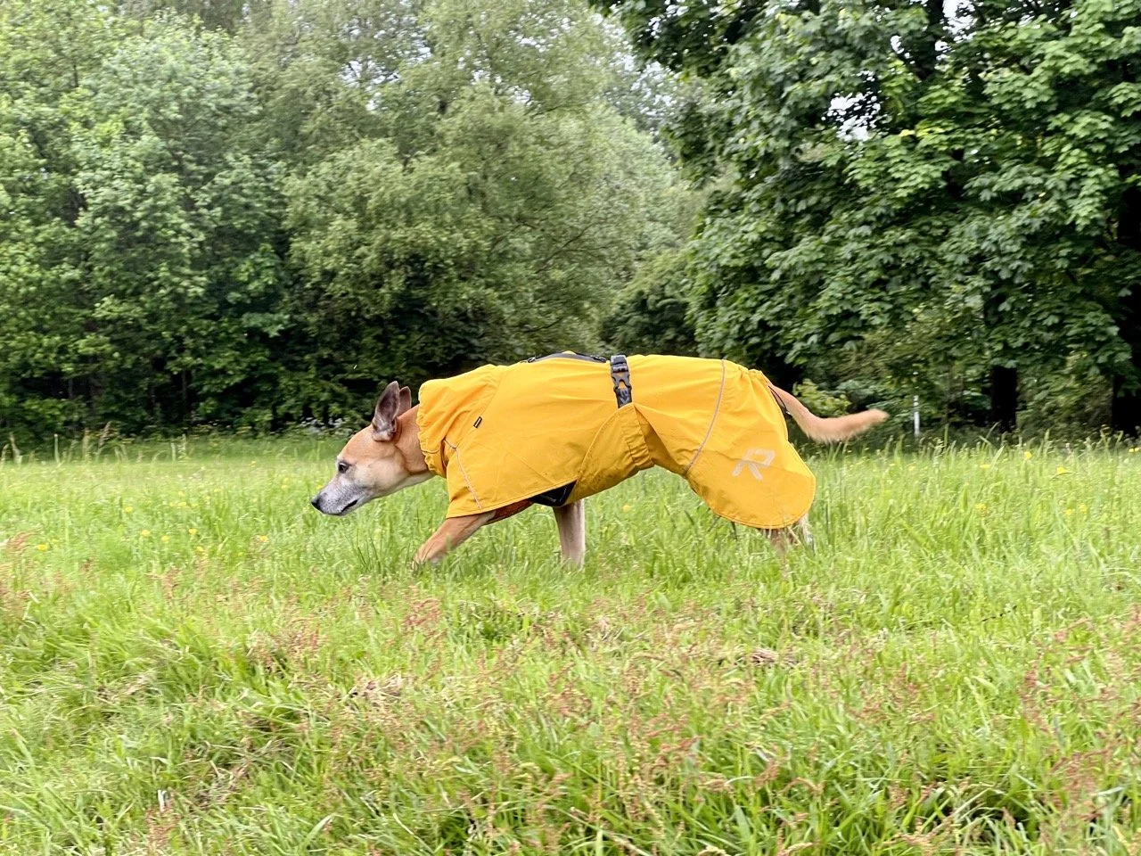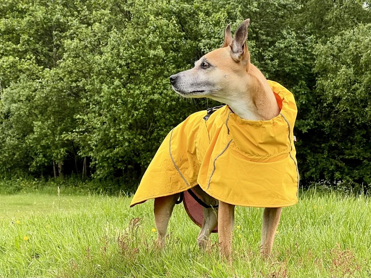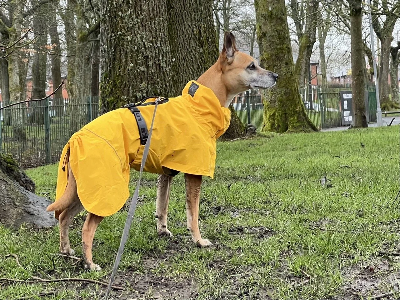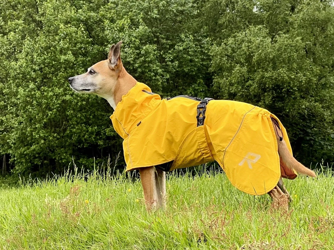 Lilly being half Whippet, half Staffy means that she has a coat that has benefits and weaknesses of both breeds. Her whippet side means she has a pretty bald tummy and groin, and the rest of her is covered with short, but incredibly dense fur from her Staffy side. This combination means that when she gets rained on the top side soaks up everything, which means she takes ages to dry, and her bare skin on the bottom half get coated with mud and water and she gets a bit shivery, so we have been looking out for a coat that would solve both issues.